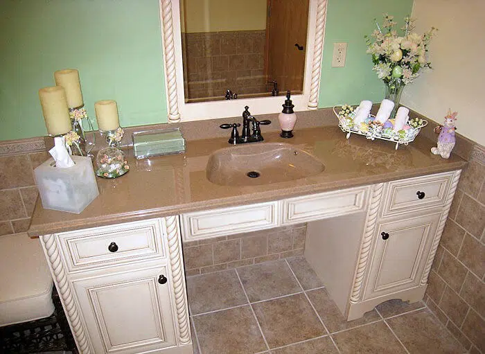 The bowl can be centered or offset, and the faucet holes can be drilled to meet your specifications. Multiple bowls are also available. Every vanity top is made to order and is made to your exact needs.