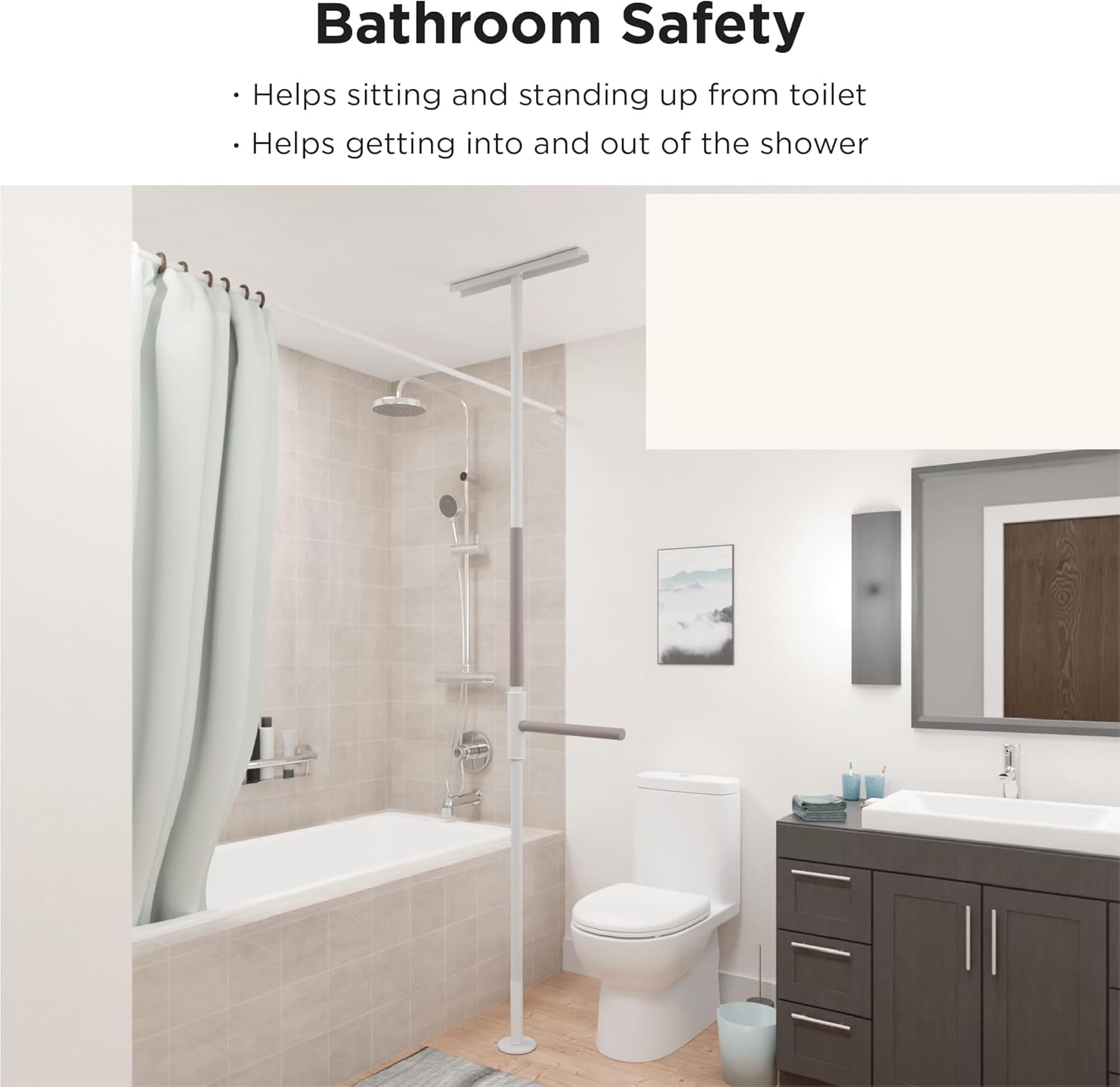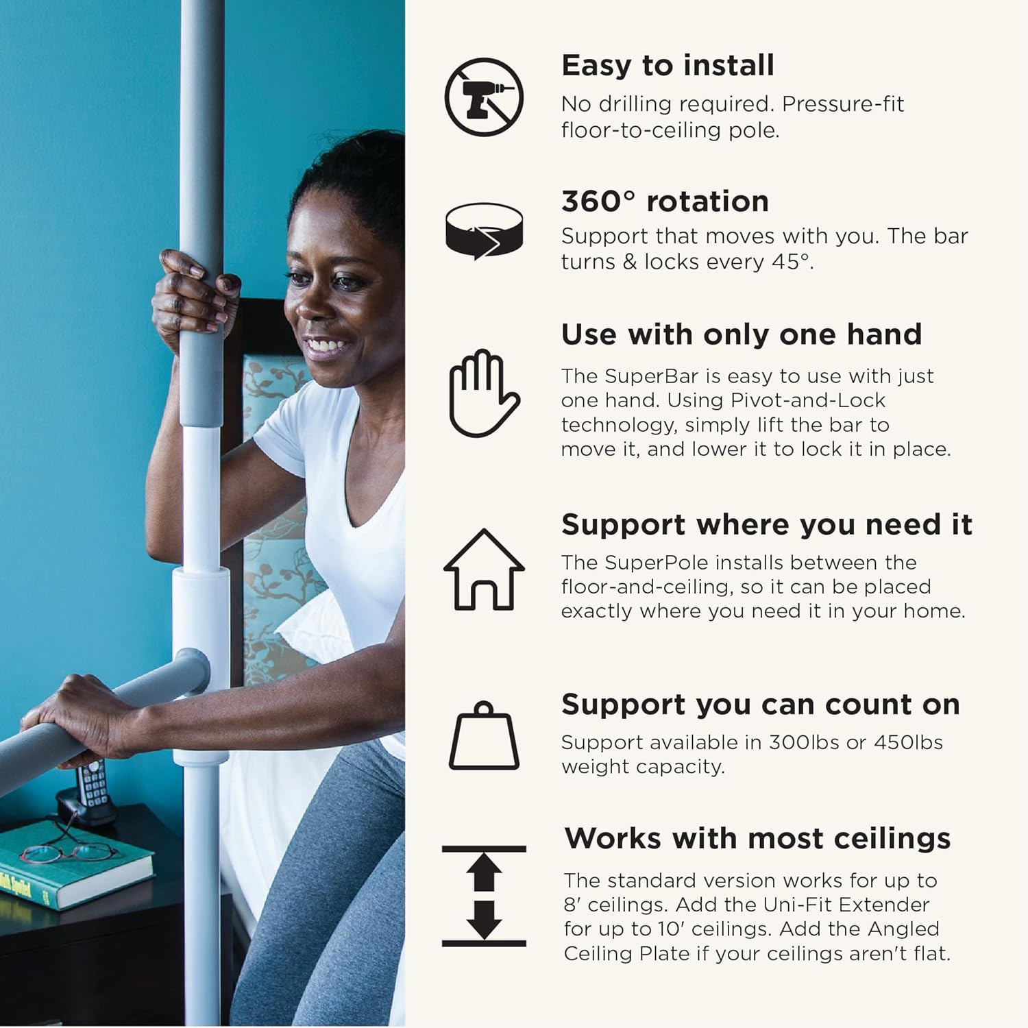 Risk – meet remedy. The SuperBar has contributed to an estimated 703M safe transfers, protecting you from the biggest risk of injury, death, loss of independence, or moving to a care facility. Tesnion-Mounted, fits heights 93-99″ Inch or extends reach up to 10Ft (100-120″ Inch) with Uni-Fit Extender (sold separately).